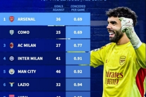 德转盘点了本赛季五大联赛球队在各项赛事场均丢球最少榜单,阿森纳与科莫并列最少,具体如下(总丢球+场均丢球):