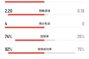 全场数据方面,巴黎射门18-3,射正6-0,控球率巴黎70%,掌控场面。