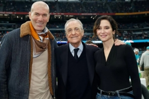 迈阿密海豚和华盛顿指挥官在伯纳乌进行了NFL在西班牙的首场比赛,赛前,弗洛伦蒂诺走上球场,与马德里自治区主席伊莎贝尔·迪亚斯·阿尤索以及皇马传奇齐达内合影。