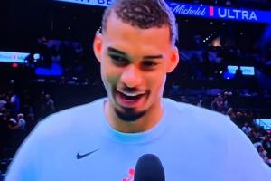 赛后文班在场边接受记者采访时说道:“如果我之前已经打满65场比赛,那我今天肯定就会轮休了。”