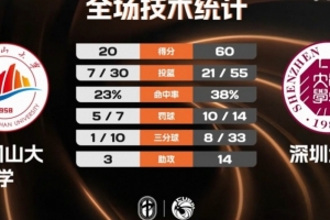末节决战,井冈山大学依然半节多时间内一分未得,李鲁粤连续篮下取分帮助深圳大学领先到40分以上。杨涵银造杀伤终于止血,但孙琦越三分再命中回应,时间所剩无几,最终深圳大学60-20大胜井冈山大学。