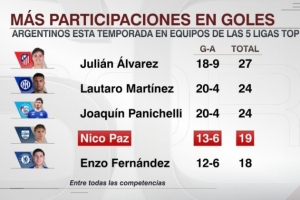 本赛季五大联赛阿根廷球员参与进球榜: