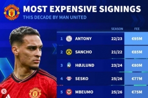 德转列曼联近年引援榜:安东尼、桑乔、霍伊伦前三,B费列第9