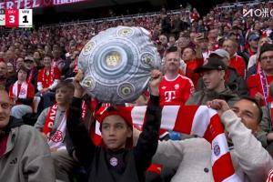 体育资讯04月20日讯 德甲第30轮,拜仁慕尼黑vs斯图加特。上半场拜仁已取得3-1的领先,距离德甲提前夺冠近在咫尺。看台上心情愉悦的小球迷高举沙拉盘抱枕。