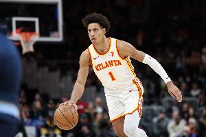 老鹰球员杰伦·约翰逊在第一节手感不佳并且失误频频的情况下,第二节找回状态,用一次一条龙暴扣带领球队打出势头。