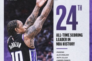 截至第四节中,德罗赞本场拿下了19分。至此他个人生涯总得分(赛前25596分)超越了英格利什(25613分),升至NBA历史第24位。接下来德罗赞将追赶卡特(25728)。