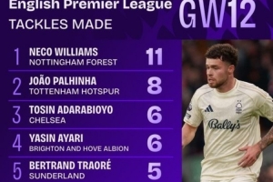 值得一提的是,11次成功抢断既是诺丁汉森林升上英超之后的单场抢断纪录,也是本赛季英超球员单场最多。