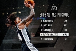 瓦塞尔迎来里程碑,他的三分命中数来到662记,超越布鲁斯·鲍文升至队史第四。
