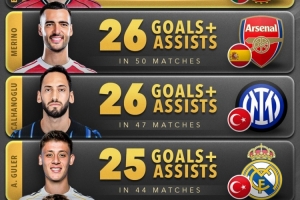 2025年五大联赛中场球员参与进球榜: