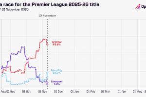 Opta晒英超本赛季截至目前的争冠概率走势:利物浦从赛季初被看好跌到目前的7%,阿森纳目前63.6%,曼城目前22.9%