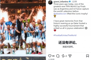 国际足联主席因凡蒂诺社媒晒出视频,回顾这场经典比赛,他写道:“三年前的今天,史上最精彩的世界杯决赛之一,阿根廷vs法国——吸引了全世界的目光,最终阿根廷队举起了那座标志性的奖杯!”