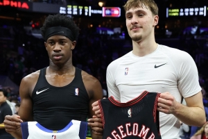 赛后,独行侠状元弗拉格和76人探花秀VJ·埃奇库姆交换了球衣。
