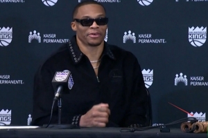 赛后,威少戴着墨镜参加新闻发布会,看起来心情很不错,他貌似还带着一节双节棍参加发布会,当记者问这是不是双节棍时,威少笑了笑没有回答,继续接受采访。