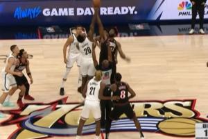 乔治把球投在篮脖子上,双方跳球!