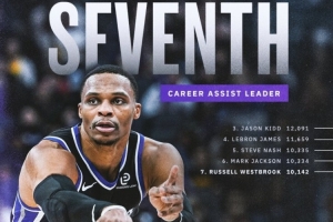 这场比赛威少迎来里程碑,助攻超越魔术师升至历史第七位。赛后,威少在社媒上转发了这一里程碑,他写道:“感恩这段旅程!”