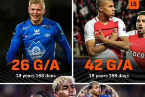 18岁的哈兰德当时还在挪威的莫尔德效力,他18岁168天时在职业赛场上的直接参与进球数为26球;同龄的姆巴佩正在摩纳哥效力,他当时的直接参与进球数为42球。