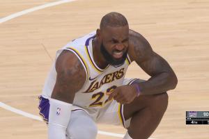GIF-德罗赞挤掩护时这下肘到了詹姆斯的腰 有些不舒服 随后被换下了