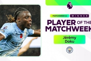 体育资讯11月11日讯 英超官方消息,经投票曼城边锋多库当选本轮最佳球员。