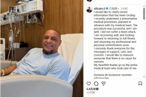 卡洛斯晒出自己在医院的照片,并配文写道:“我想澄清一下最近流传的一些信息,我最近接受了一项预防性医疗程序,这项程序是事先与我的医疗团队商定的。程序很成功,我目前身体状况良好,我没有心脏病发作。”