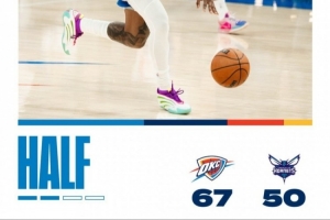 体育资讯1月6日讯 NBA常规赛,雷霆半场50-67大比分落后黄蜂。