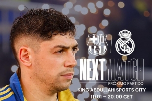 皇马官方社媒晒出海报,预热这场国家德比,队内中场巴尔韦德单人出镜。