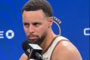 赛后,库里接受媒体采访期间记者手机铃声响了,库里随即跟随音乐开始扭动身体。