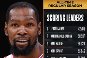 杜兰特生涯总得分来到31562分,正式超越诺维茨基(31560分),荣升NBA历史得分榜第六!