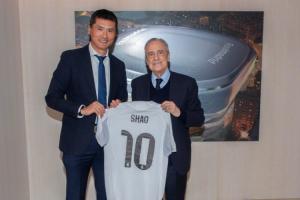 排面!国足主帅邵佳一到访皇马,与弗洛伦蒂诺合影+获赠10号球衣