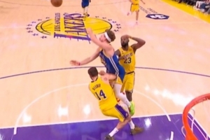 GIF-波杰姆斯基反击行进间撞翻克莱伯被吹进攻犯规,勇士挑战成功,改为阻挡犯规