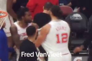 昨日第三节结束,伊森和亚当斯有些冲突,互相拉拽球衣,火箭助教迅速介入拉开双方。火箭其他球员也有些懵……