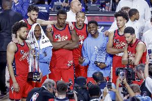 体育资讯2月16日讯 NBA全明星正赛决赛,美国新星队47-21击败美国星条队,夺得冠军。