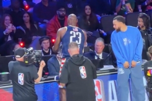 NBA记者Grant Mona晒出一段全明星现场花絮,美国星条队球星詹姆斯在赛前完成经典的抛撒镁粉仪式,因伤缺阵的队友库里在一旁探头探脑近距离观察,还一度想要进行模仿。随后,詹姆斯与库里击掌致意。