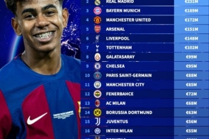 以下为2025年俱乐部球衣销售收入top20: